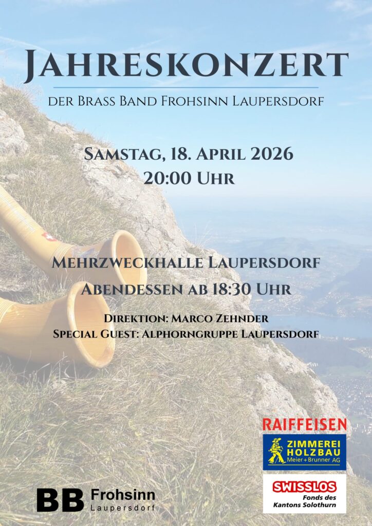 Auch dieses Jahr findet unser Jahreskonzert wieder statt, dieses mal mit der Alphorngruppe Laupersdorf zusammen. Heute in einem Monat ist es soweit!